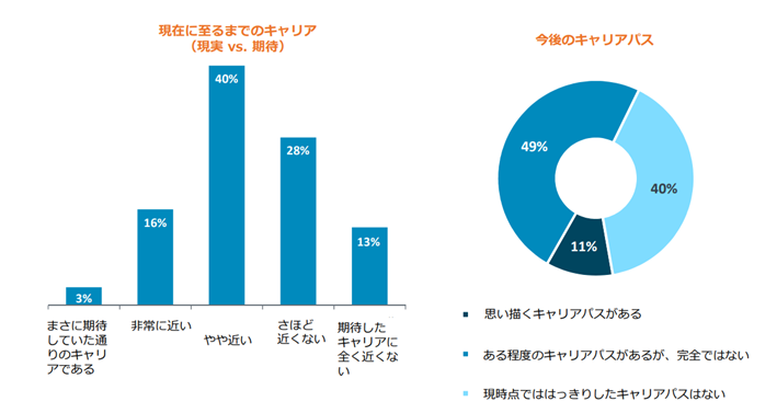 本調査の中で日本からの回答者に注目をしてみると、約40%の回答者が現在の自身のキャリアと期待していたキャリアが合致しないと回答をしています。また、実に90%近くの方が、今後の自身のキャリアパスを明確に思い描いていないと回答をしています。
