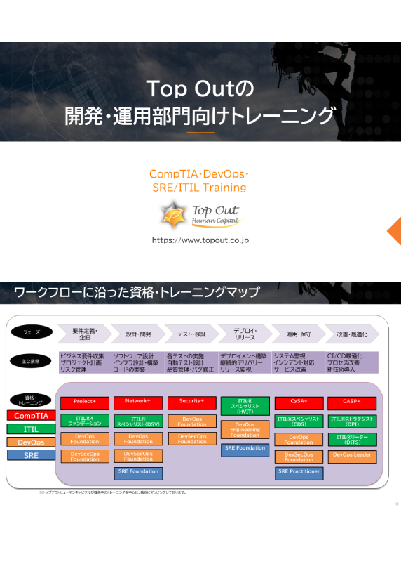 主にCompTIA、EC、CYBERGYM、ISACA、DevSecOpsに関連したトレーニングを、まとめて1つの資料でご紹介しています。